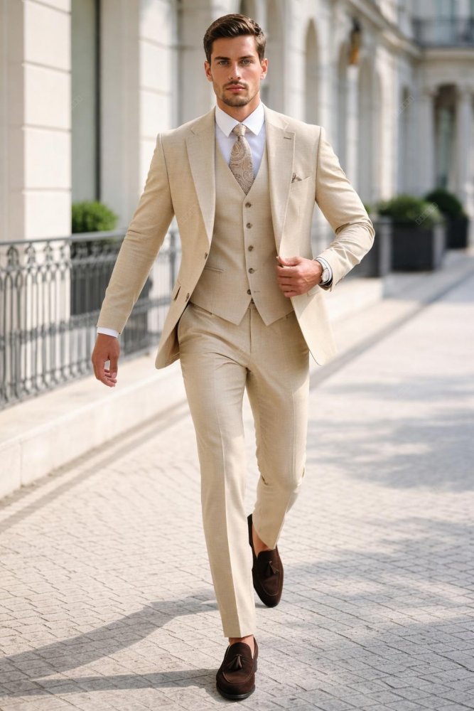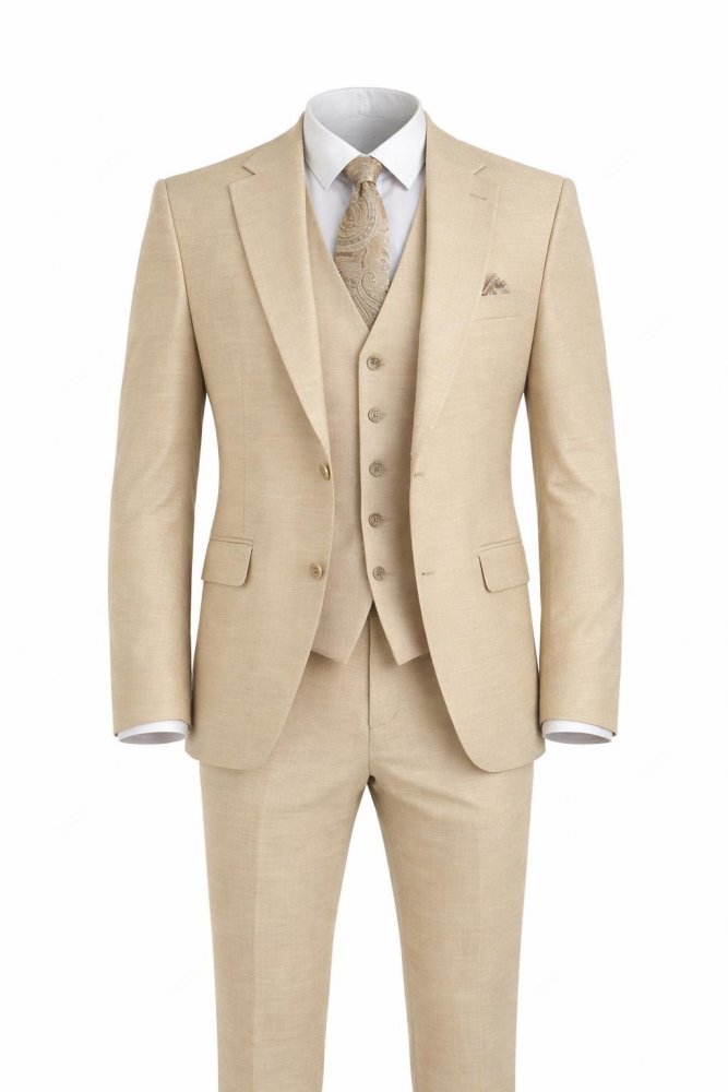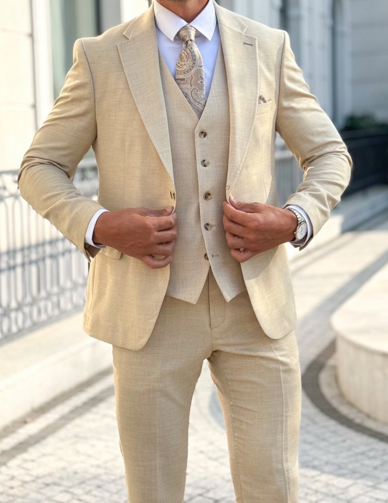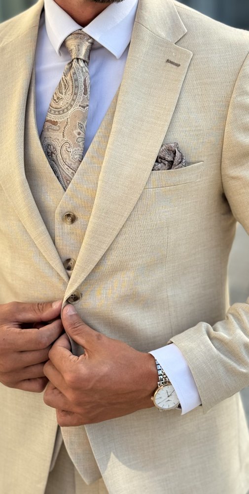 Trzyczęściowy garnitur męski w pięknym kolorze beżu wykonany z bardzo przyjemnej tkaniny wysokiej jakości.