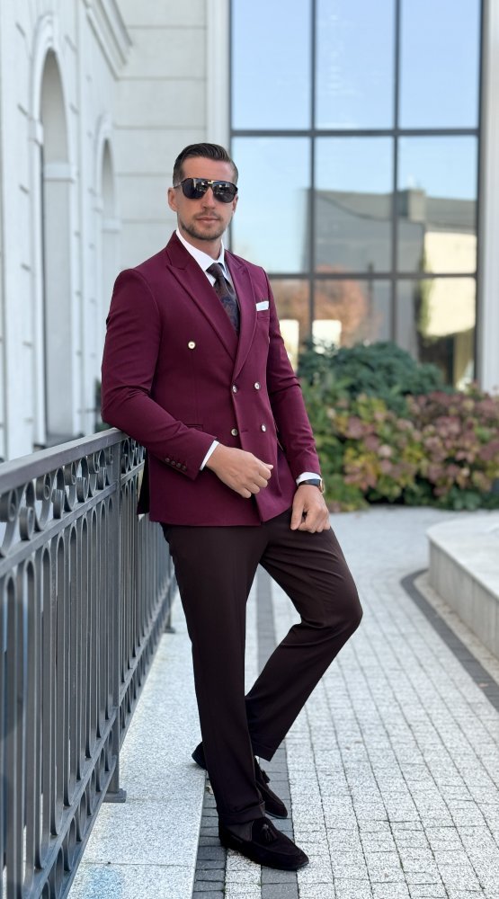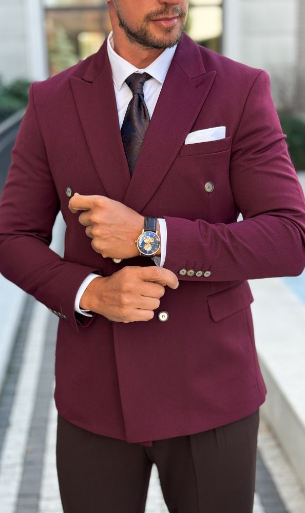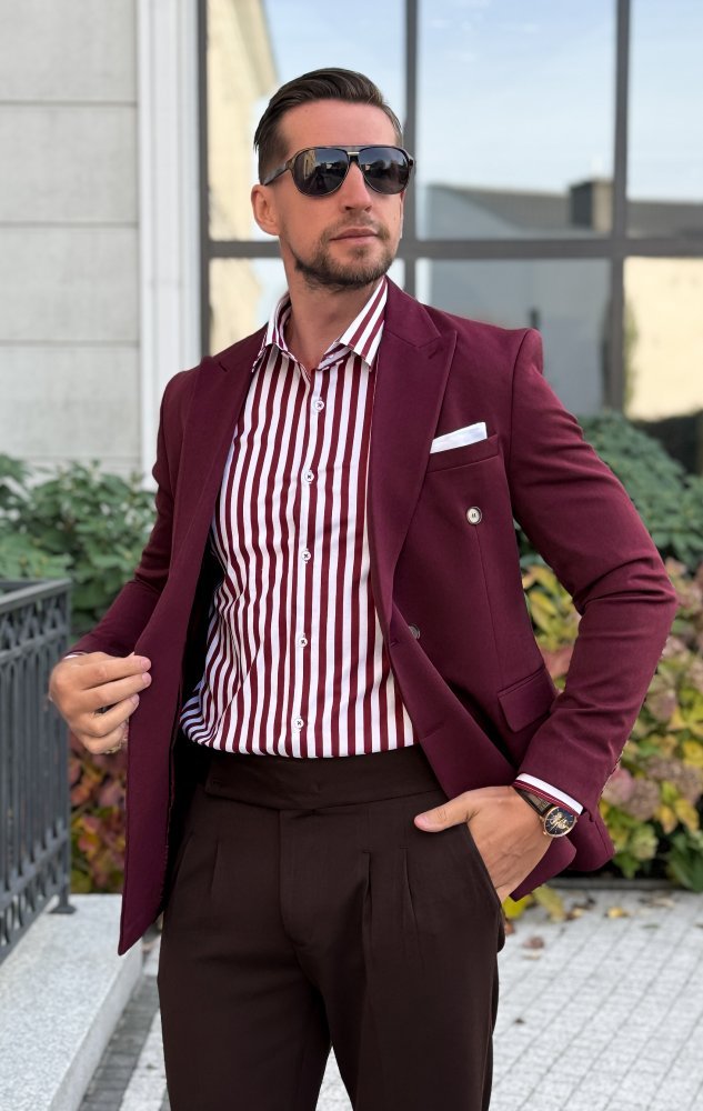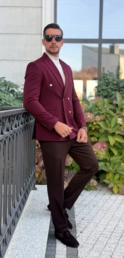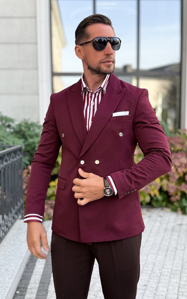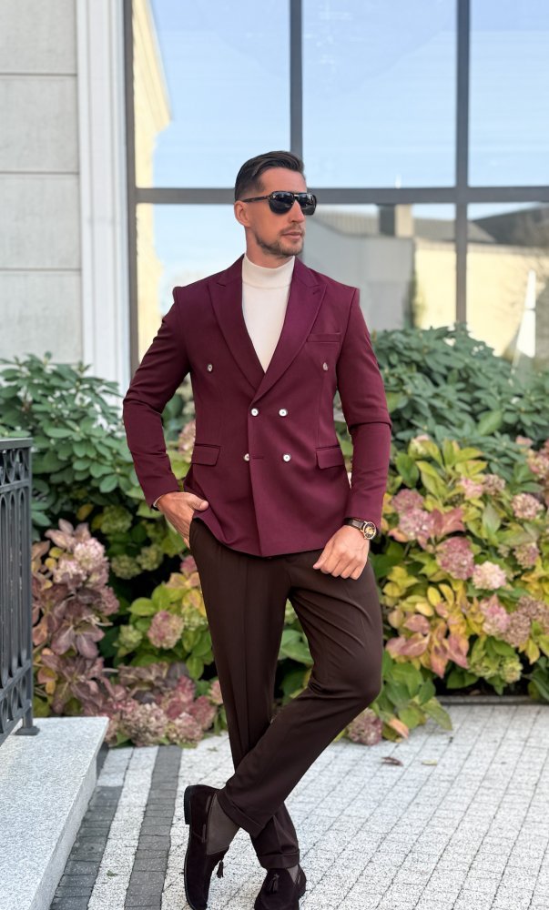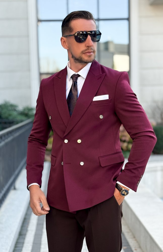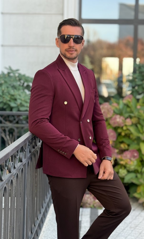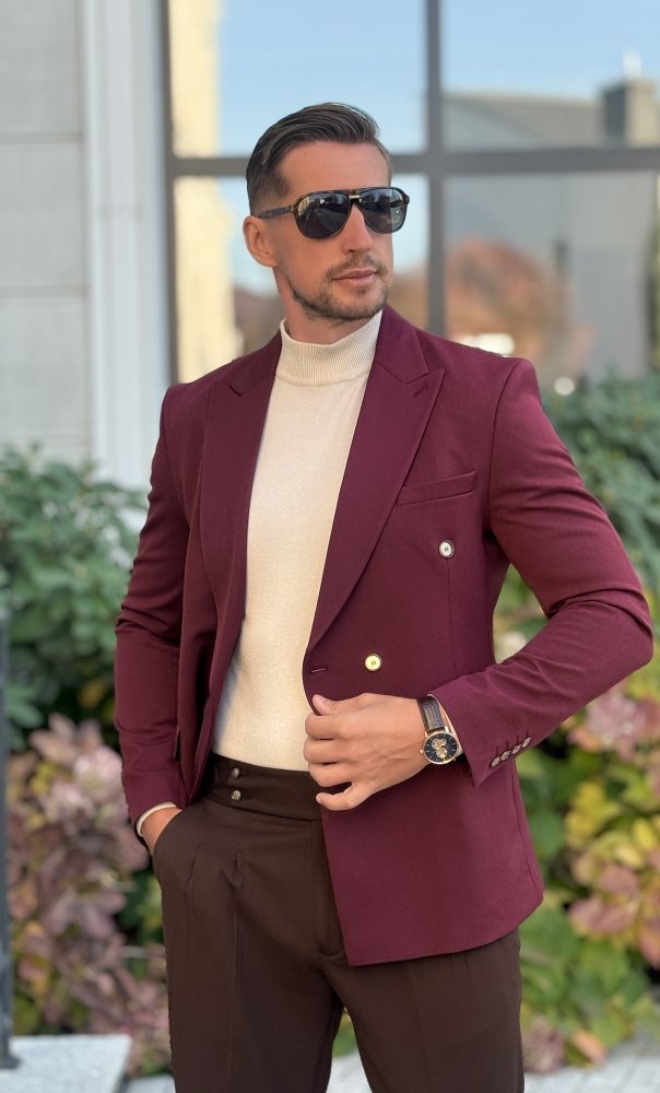 Marynarka dwurzędowa w pięknym i uniwersalnym kolorze bordowym. Posiada dwie kieszenie od środka i dwie na zewnątrz. Najnowszy model. Marynarka na podszewce dzięki czemu idealnie sprawdzi się o każdej porze roku. Idealna do jeansów czy chinosów.