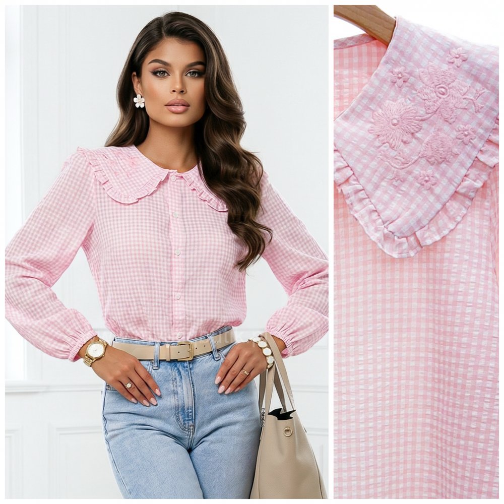 Stylowa bluzka koszulowa w kratę z ozdobnym kołnierzem w stylu Baby Doll. Klasyczny, kobiecy fason, który świetnie sprawdzi się zarówno do codziennych stylizacji jak i tych bardziej eleganckich.