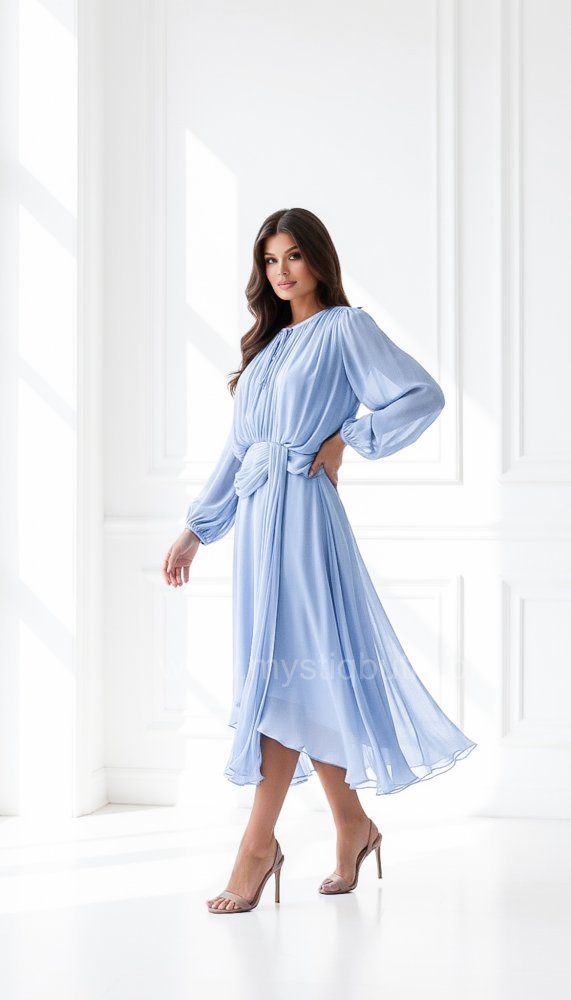 Piękna rozkloszowana sukienka wykonana z delikatnego szyfonu.Przy dekolcie małe rozcięcie z wiązaniem. Zaznaczona talia podkreśli Twoją sylwetkę.